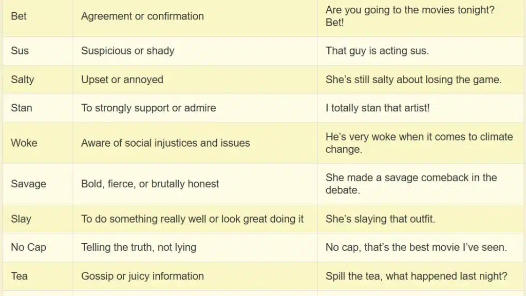 | Slay | To do something really well or look great doing it | She’s slaying that outfit. | |